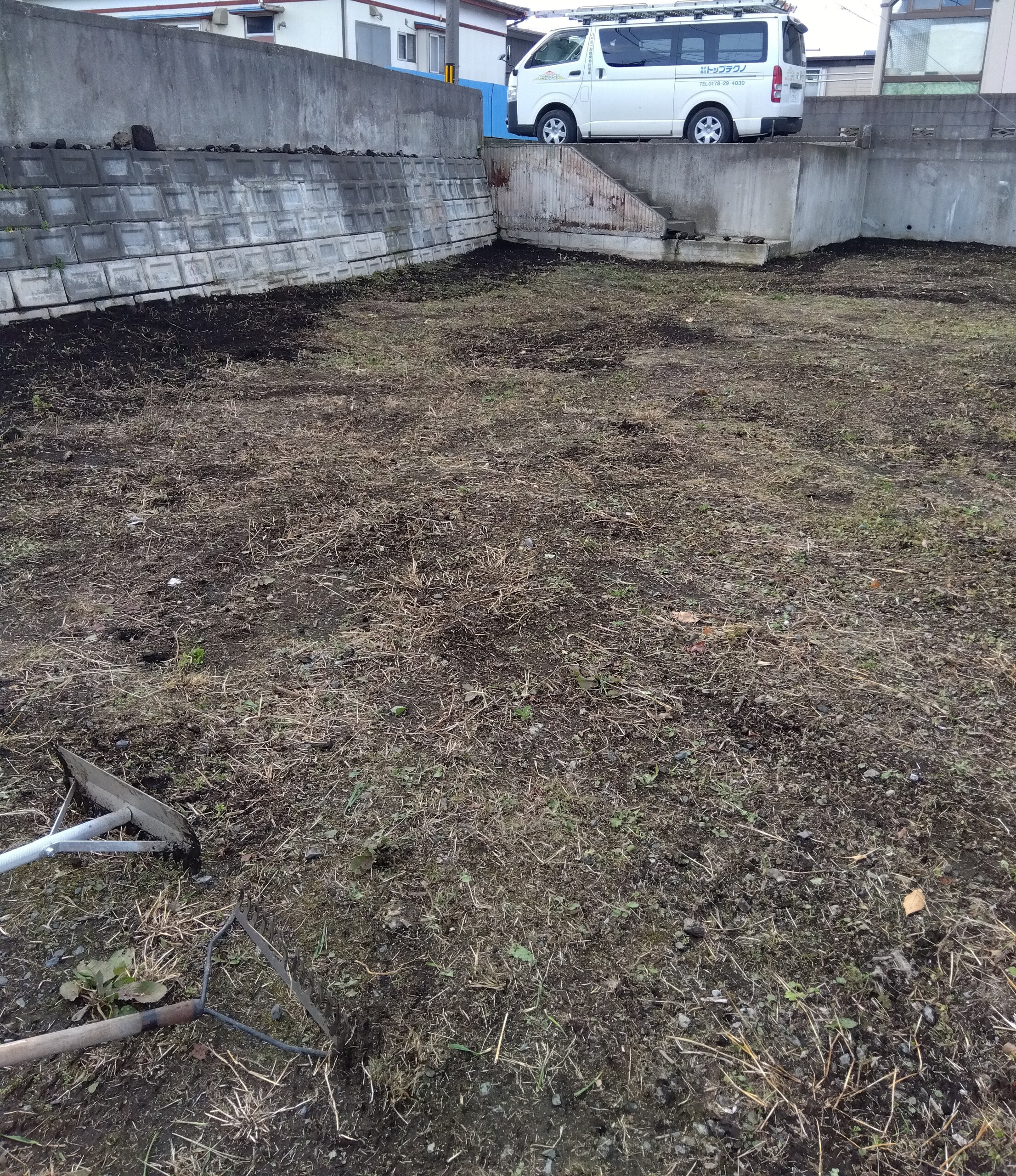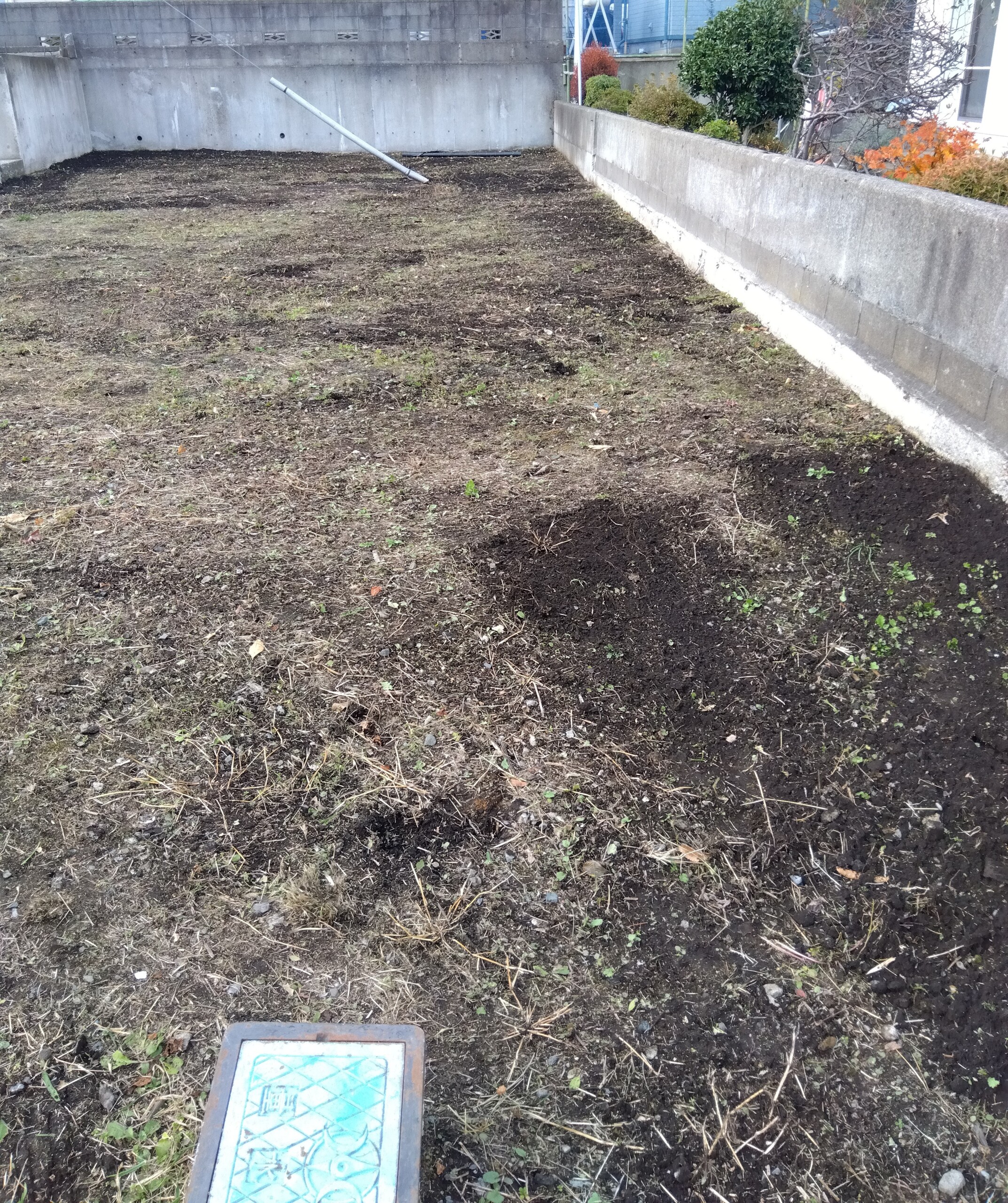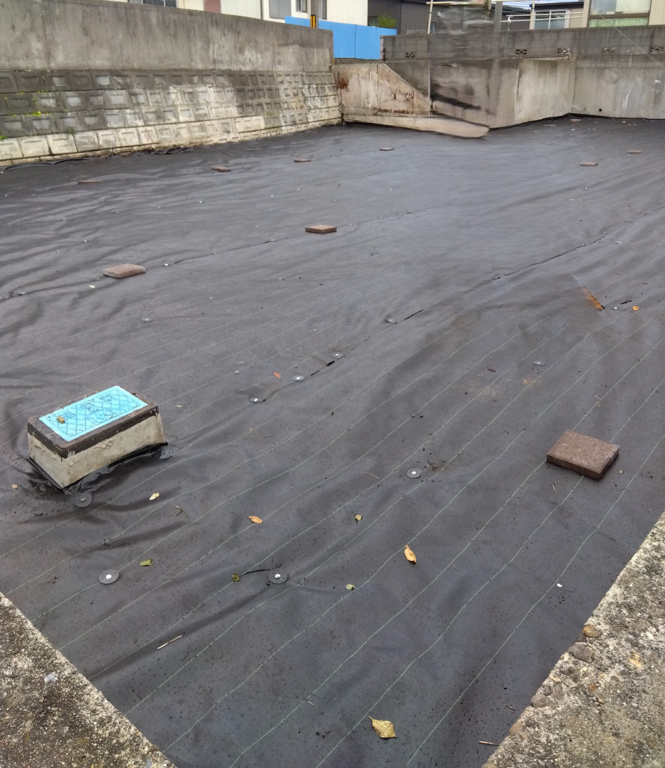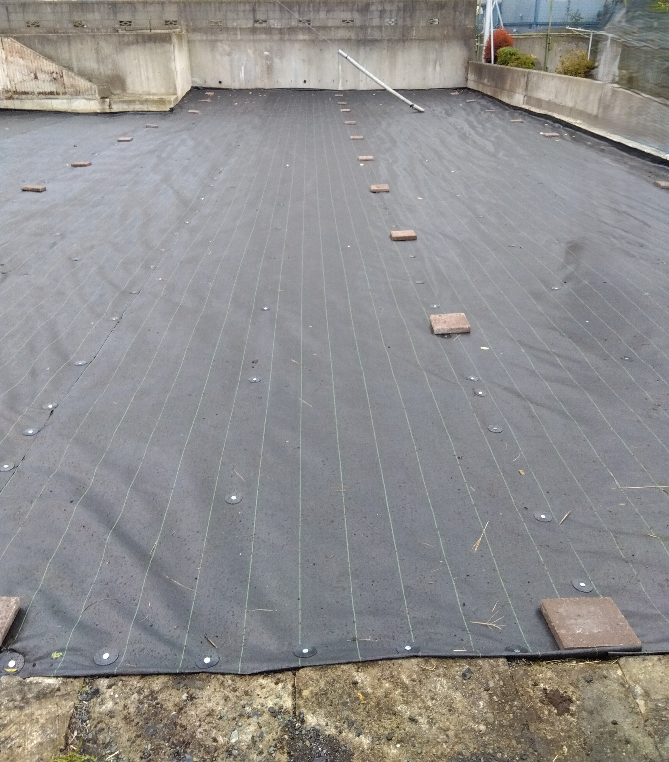 前回から生えてきた所を除草して、全体を整地した後シートを設置しました。